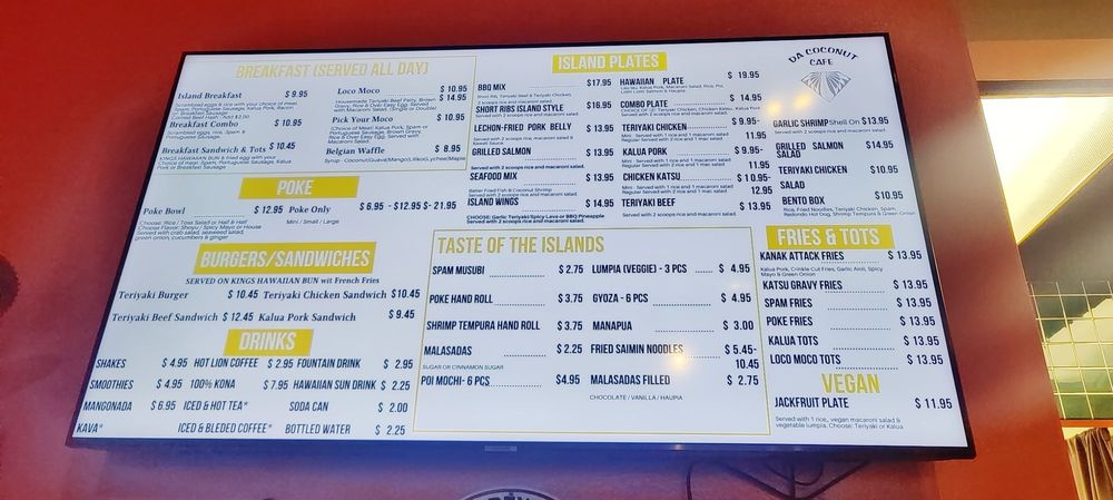 Located in Temecula, Da Coconut Cafe invites you to enjoy authentic Hawaiian flavors with an inviting Aloha spirit. The highlight of the menu is the delicious Poke Bowl, featuring fresh-cut fish paired with rice and a lively mix of salads and toppings like crab salad and seaweed salad, all for just $19.95. The sides offer a taste of Hawaii with Kalua Pork and Poi Mochi, satisfying cravings for traditional island fare.